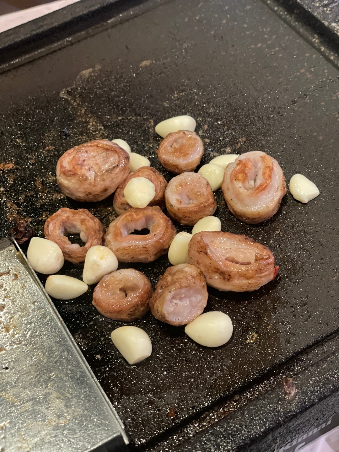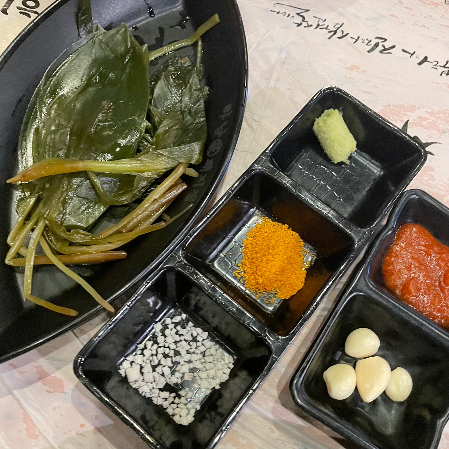 그럼 직원분이 고기 구워주실 준비를 하시고 명이나물과 왕소금 및 마늘을 주세요.