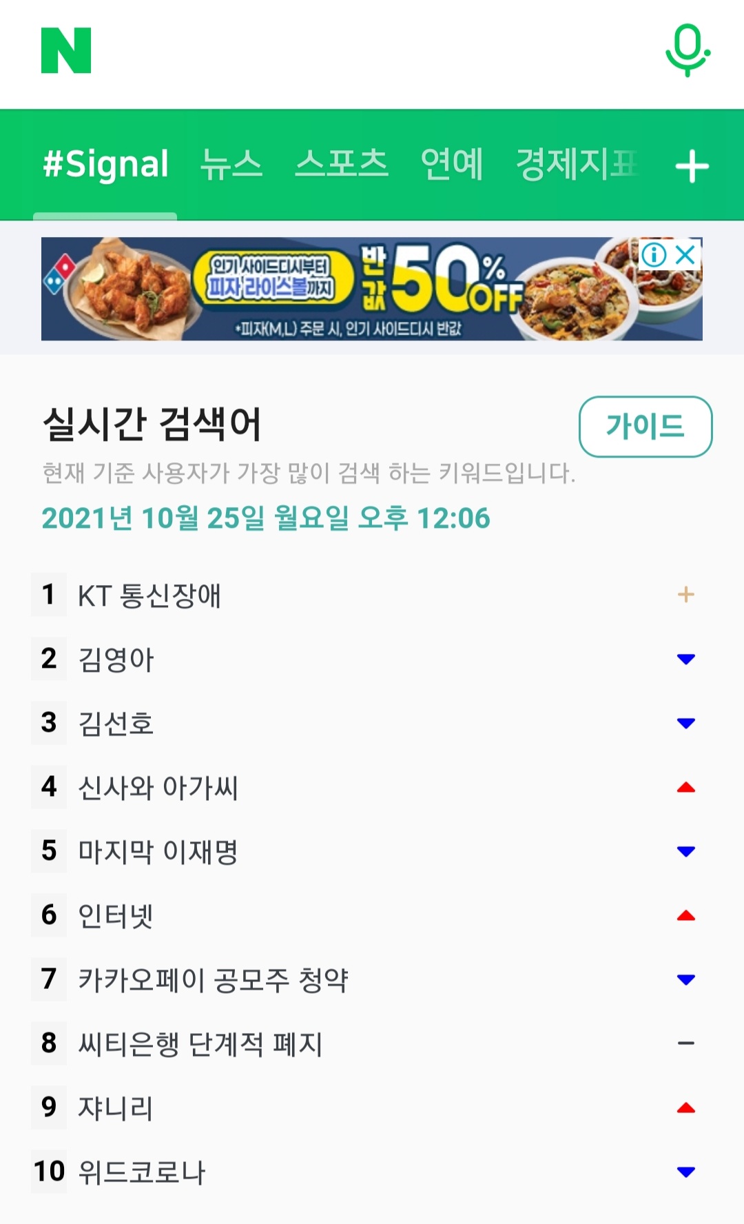 실검 순위는 당연히 KT통신장애가 사뿐히 1위를 기록하고 있고, 빠른시간 내로 전체복구가 됬음 좋겠네요.