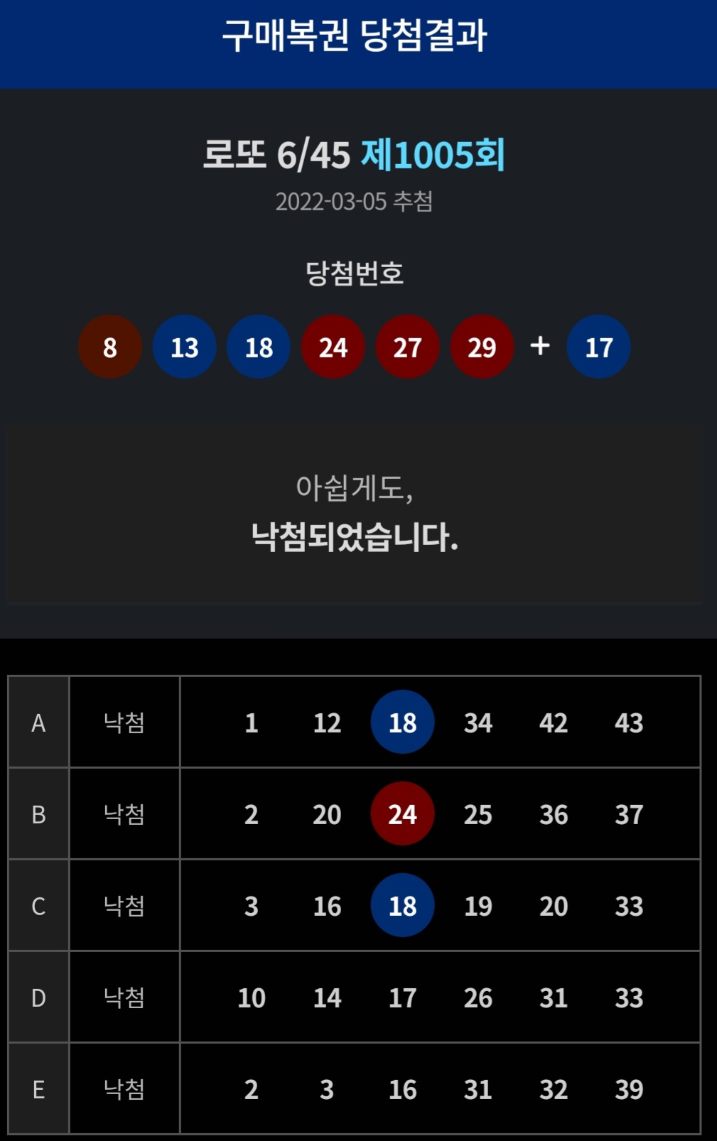 이번에 5000원정도는 당첨 될 때가 됬다고,