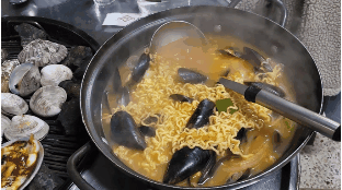 조개구이 소 + 라면 + 진로를 시켰어요.