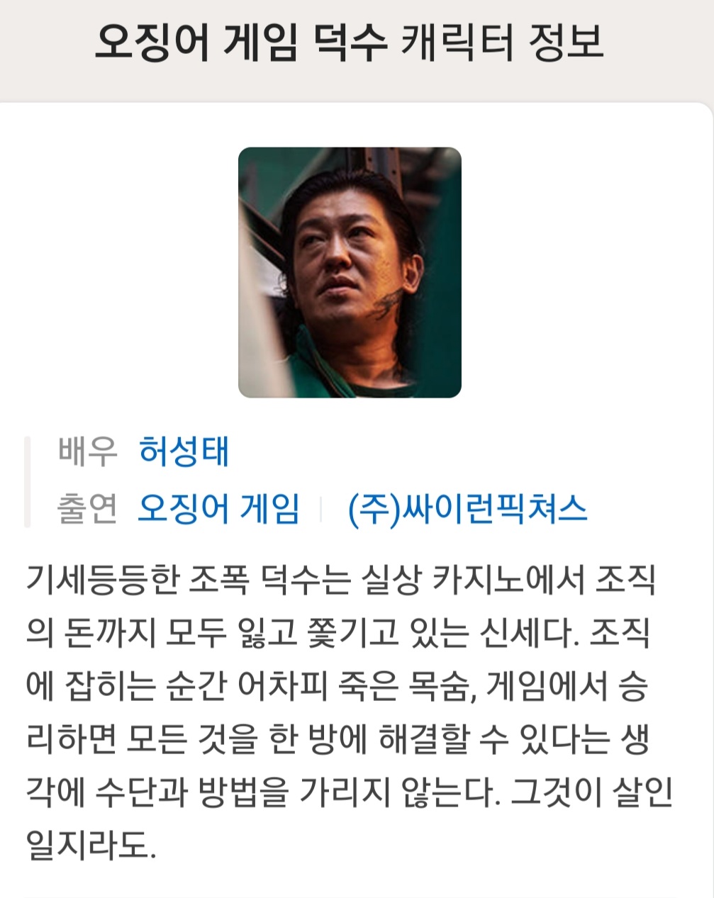 오징어게임에 나오는 무서운 조폭아저씨 역활의 덕수형에 대해서 글써보려 해요.