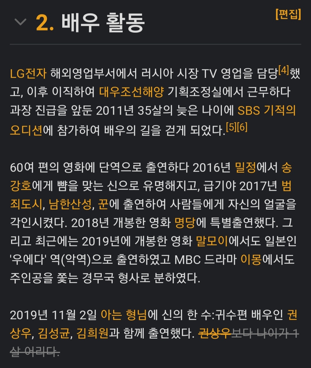 허성태배우님은 나무위키 에도 소개 되어 있지만 SBS오디션 프로그램에서 데뷔를 했는데 그때의 나이가 35..