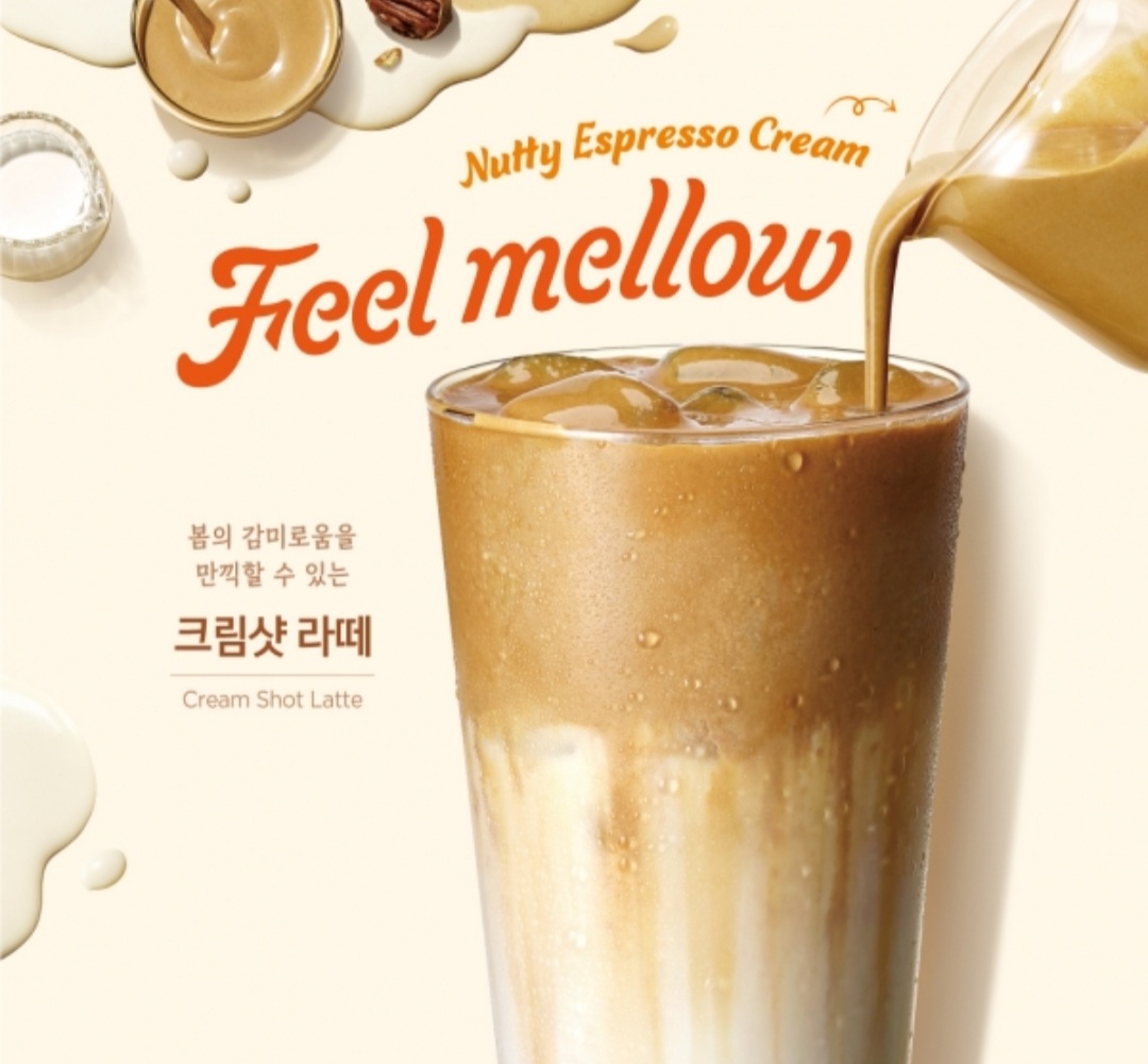 크림샷라떼는 에스프레소 깊은 맛에 우유와 견과류의 고소함, 크림의 달달구리한 맛이 조화롭게 어우러진 음료라고 합니다.