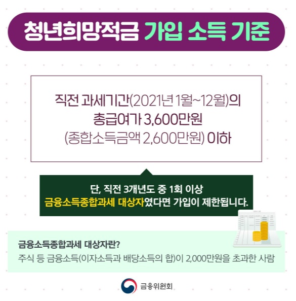 **직전 과세기간(2021년 1월~ 12월)의 총 급여가 3,600만원 이하인 만 19~34세 청년이면 가입가능.