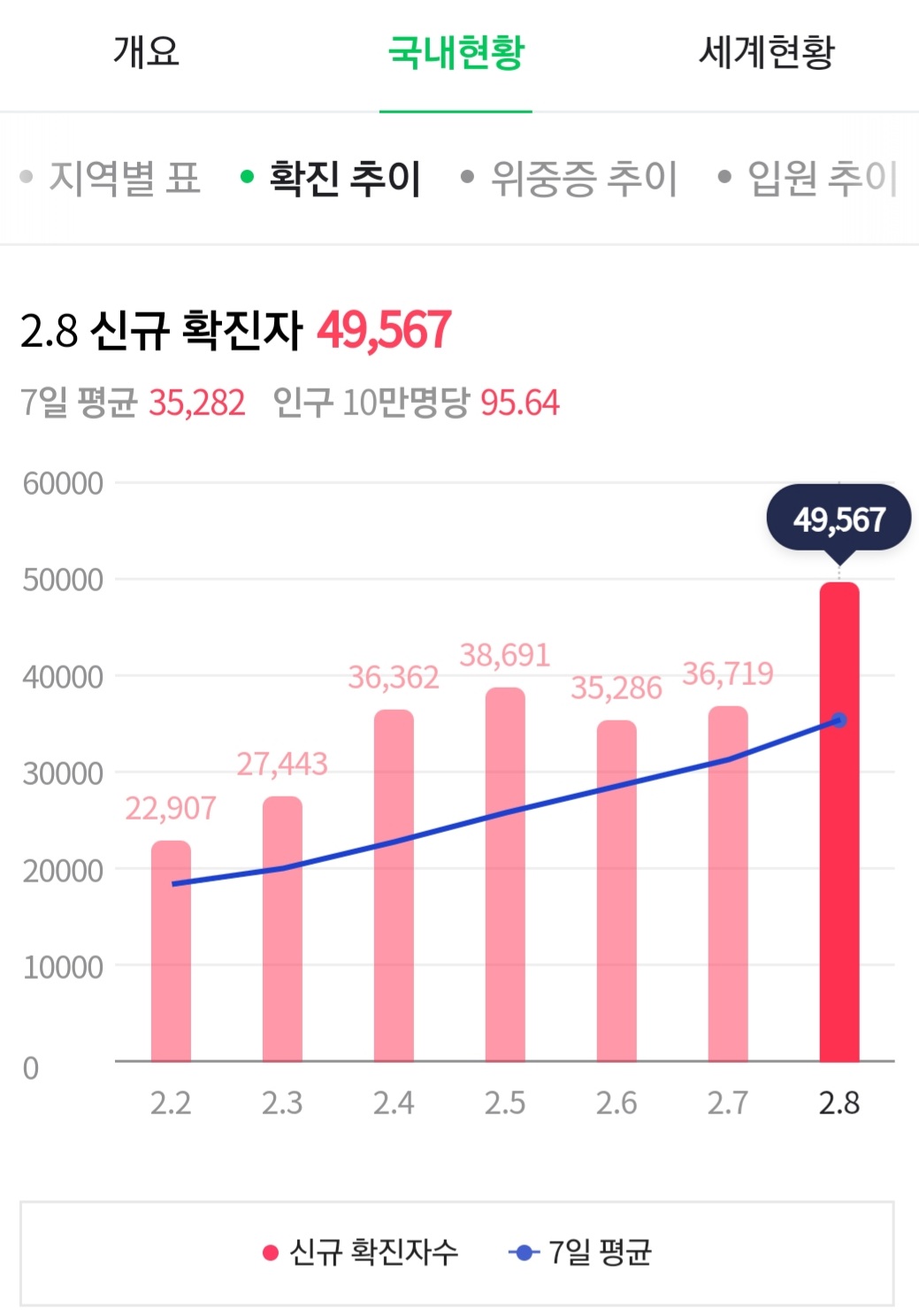 2/9일 기준, 신규확진자가 5만명을 육박하고 있습니다.