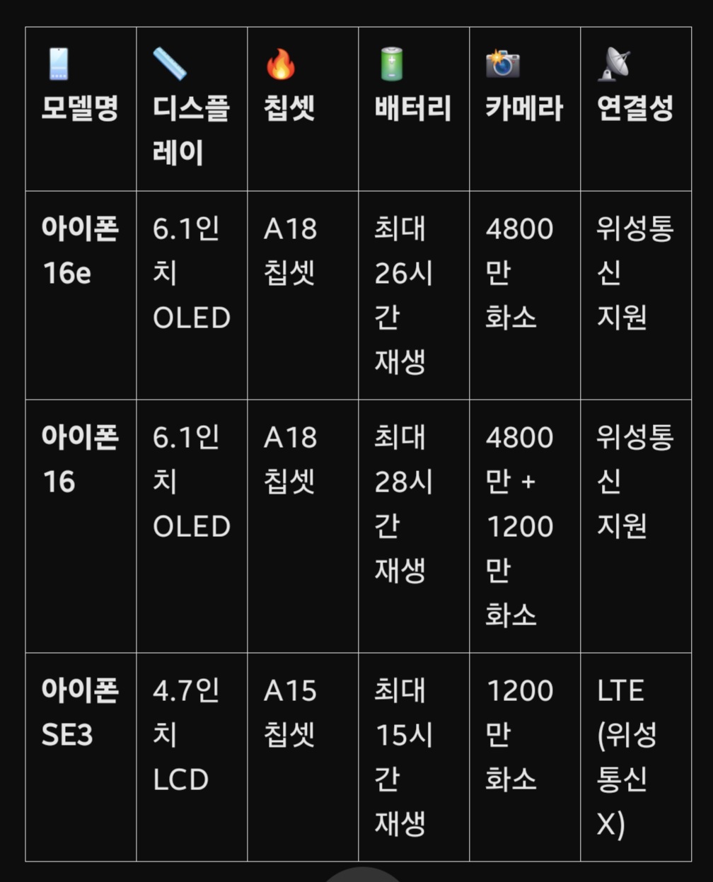 📊 2️⃣ 아이폰16e 스펙 비교! (아이폰16 vs SE3 vs 16e)