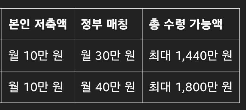 총 1,440만 원(본인저축 360만 원 + 정부지원 1,080만 원)을