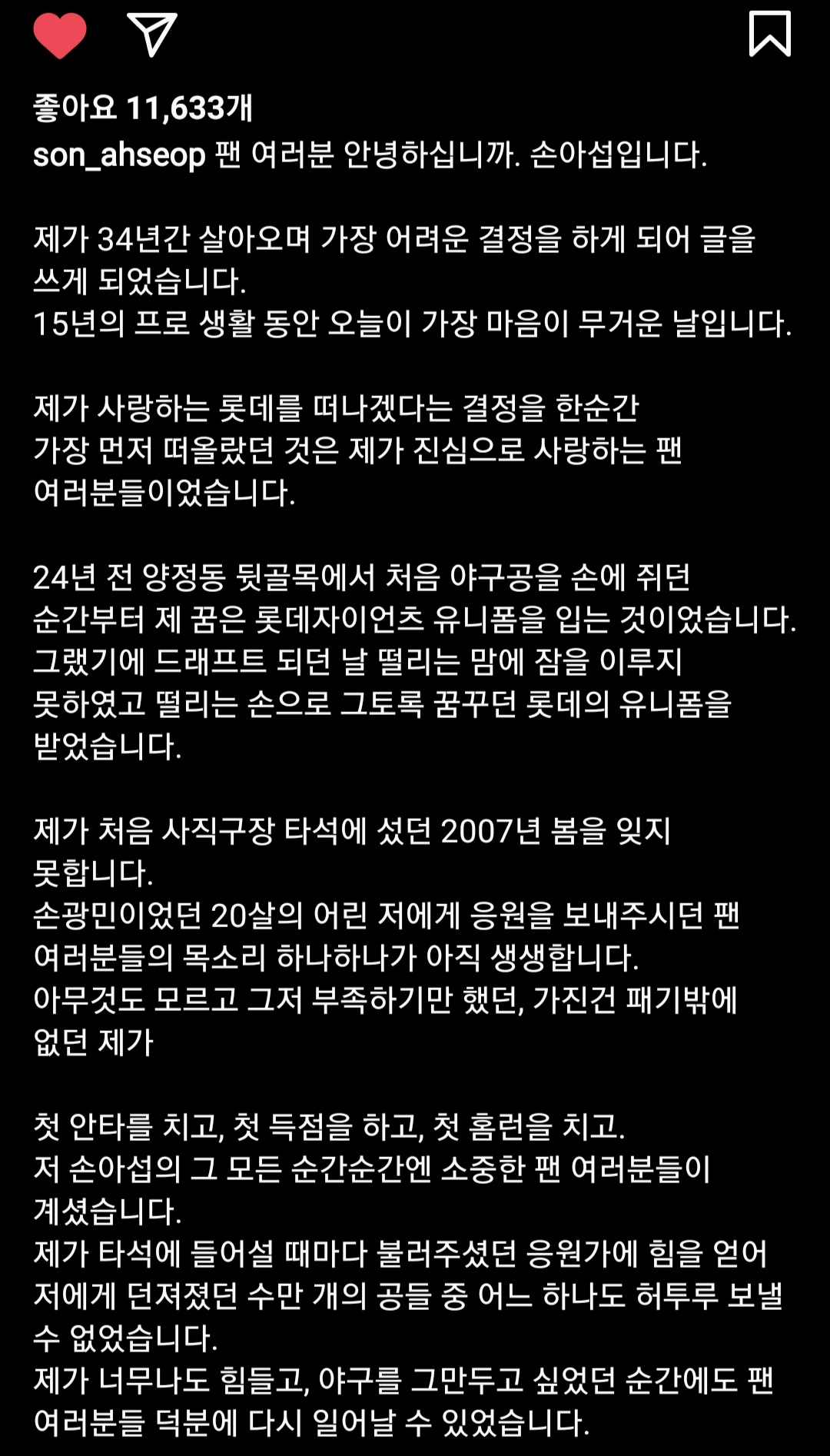 보는사람이 응원을 할 수 밖에 없는 선수였던것 같습니다. 저도 그런 손아섭 선수를 많이 응원하고 했지만 솔직하게 롯데는 로이스터 감독 이후에 우승권에서 점점점 멀어져 이지경까지 왔다고 생각하고, 팬들도 등돌리게하는 그런팀으로 된 게 참 안타깝습니다. 😭😭