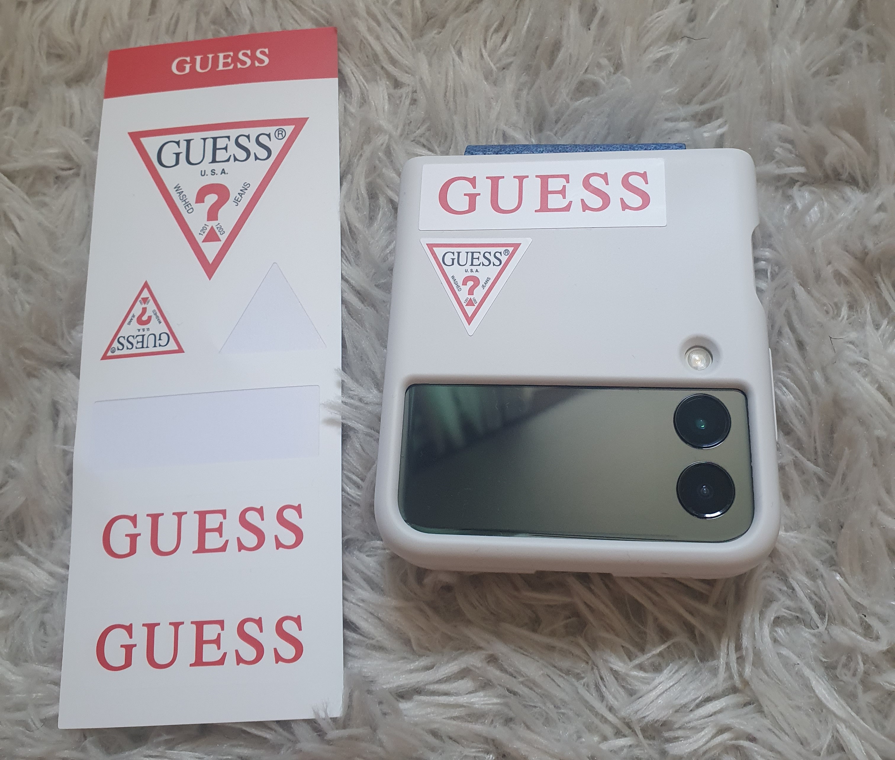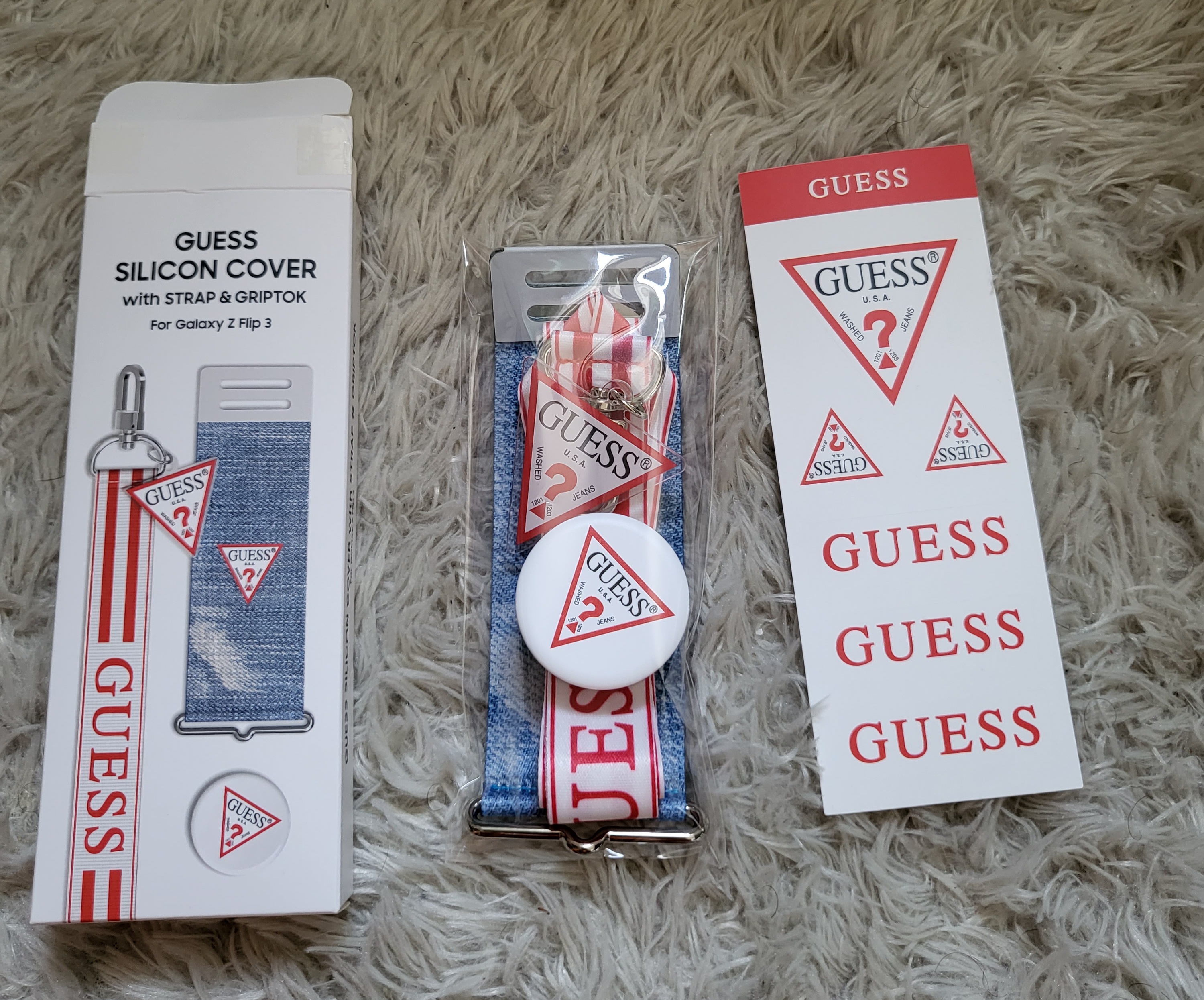 박스를 뜯고 상자를 열어보니 기다렸던 Z플립3 게스로고가 있는 스트랩, 그립톡, 스티커, 목걸이가 들어 있었어요. 👏👏